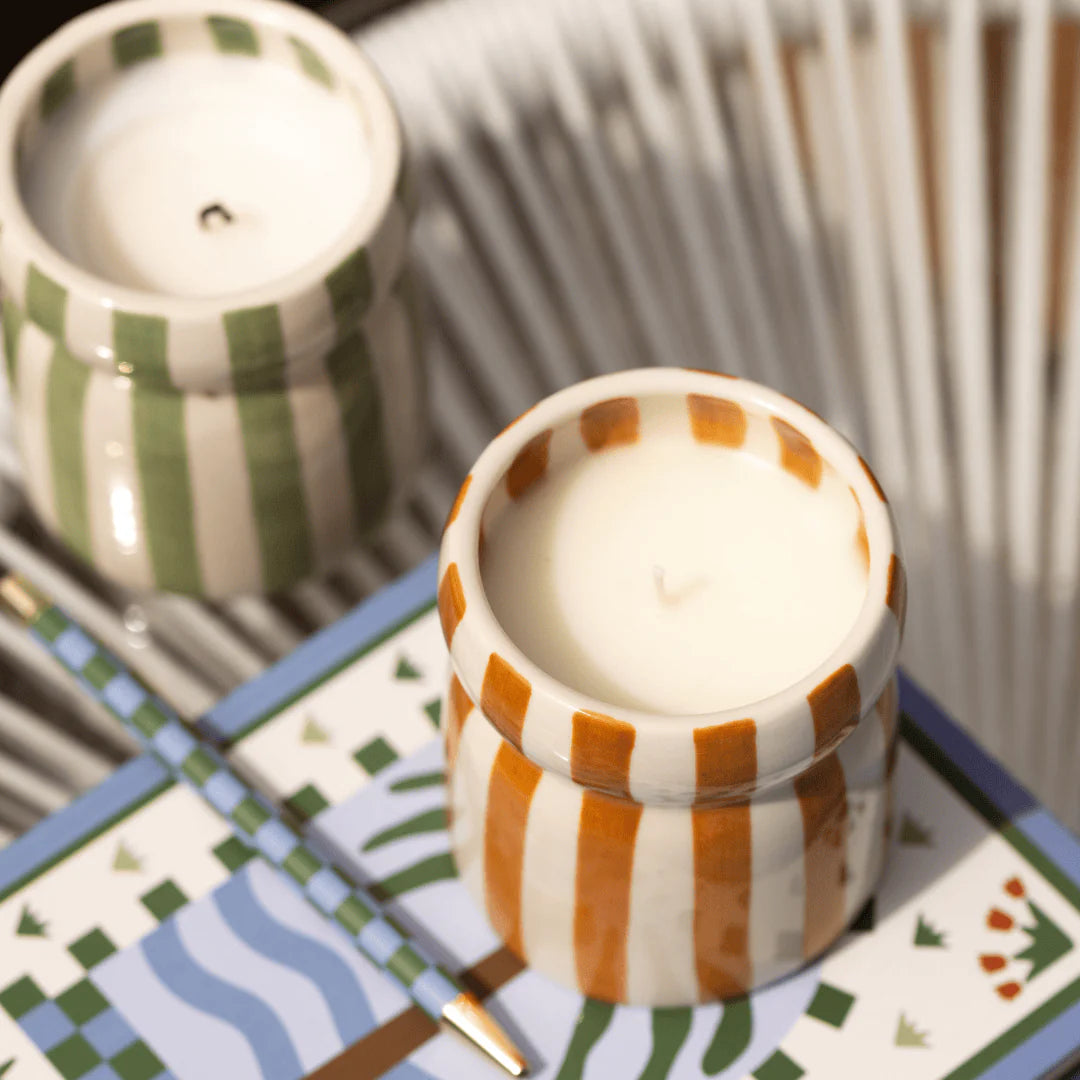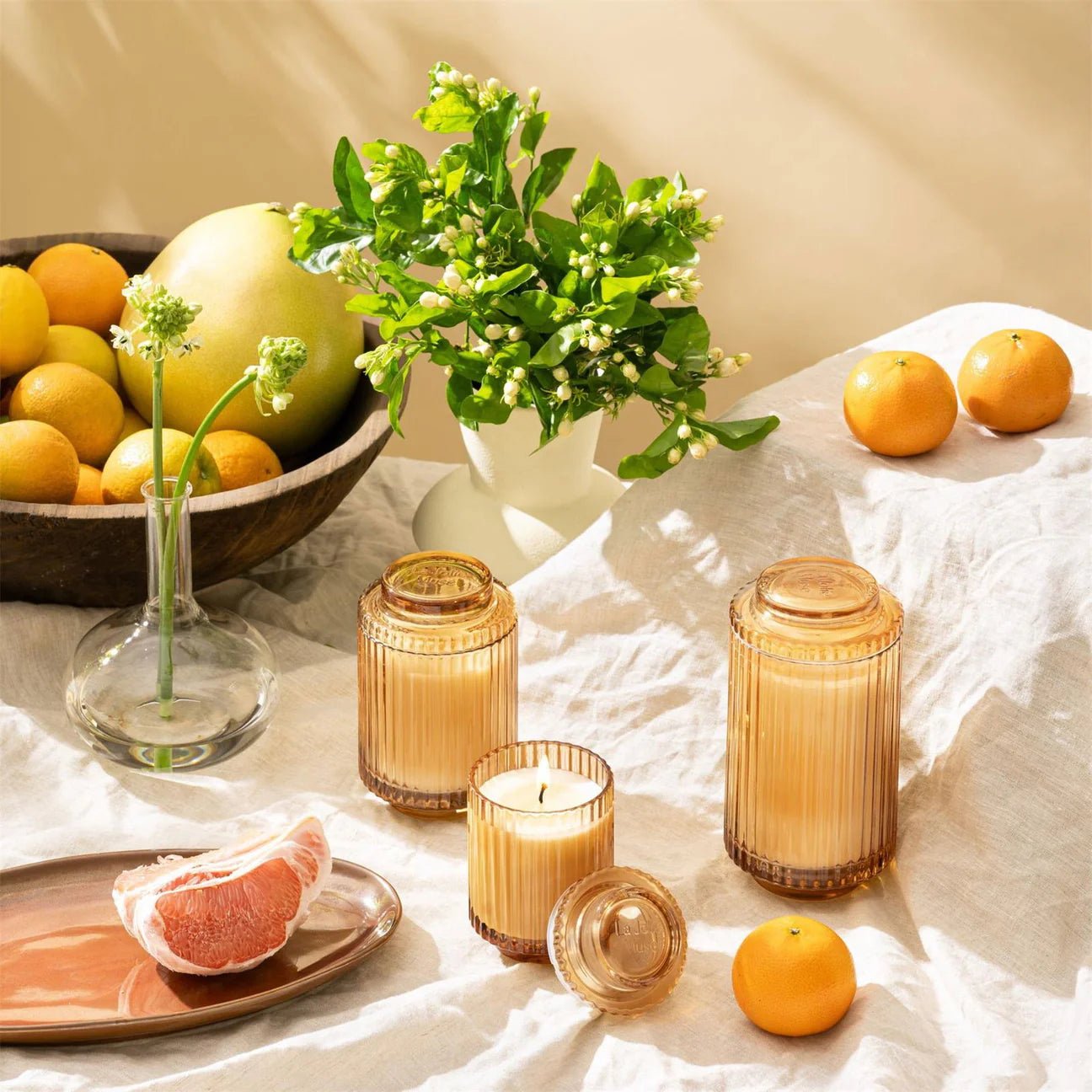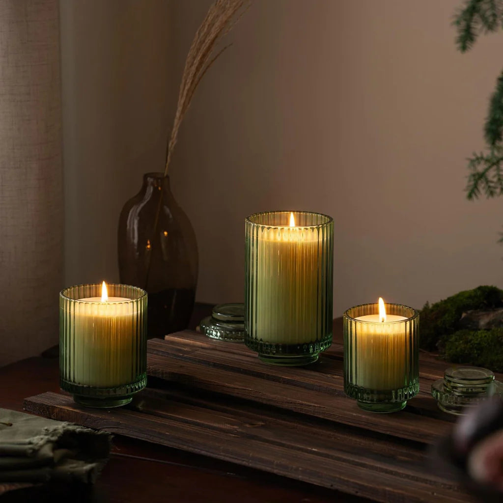 Elevate your space with Amélie: Timeless ribbed glass candles, reminiscent of the Acropolis grandeur. Available in calming colors, they offer a sustainable 60-hour burn with natural soy wax and seamlessly become elegant keepsake containers.